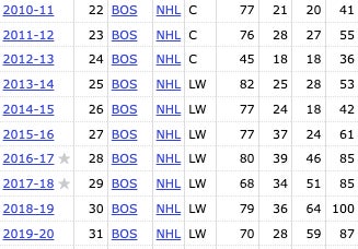 9th (full) season of his career. Had pretty consistently been a 50-60 point scorer up until that point. 2x All-Star. And now could hit the 100 point mark for the first time ever. That's right, folks. I'm talking about 2018-19 Brad Marchand.